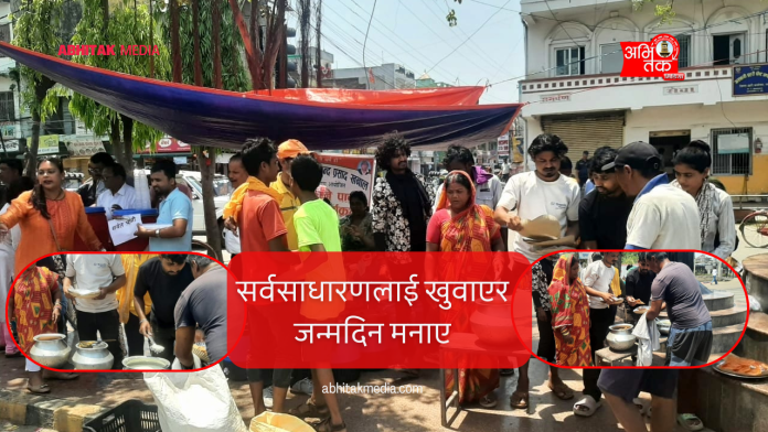 वीरगंजको घण्टाघर अगाडि दिनदुखी, असहाय तथा बटुवाहरु गरी झन्डै ७५ जनालाई खिर-पुरी, आलु-परवलको तरकारी,जिलेबी खुवाएर भाईको जन्मदिन मनाएको दाजु कलाकार राजा गिरीले बताए ।