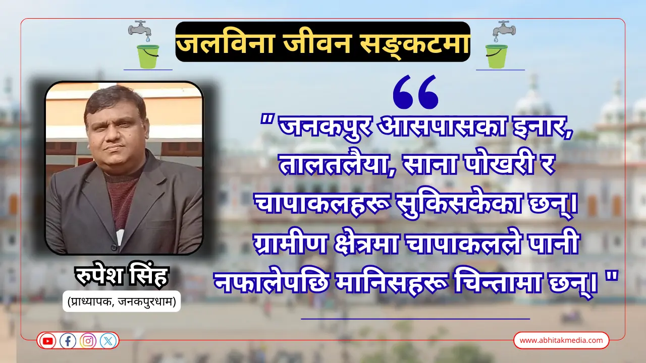 मधेश प्रदेश, विशेषगरी जनकपुरधाम र आसपासका क्षेत्रहरू गम्भीर जल सङ्कटको चपेटामा परेका छन्। पर्याप्त वर्षा नभएकै कारण यहाँको जनजीवन मात्र होइन, कृषि, पशुपालन, पर्यटन, व्यवसाय र दैनिक गतिविधिहरूमा गहिरो असर परेको छ। जनकपुर, जसलाई ऐतिहासिक, धार्मिक र सांस्कृतिक रूपमा महत्वपूर्ण शहर मानिन्छ, अहिले पानीको लागि हाहाकार मच्चिएको अवस्था छ।