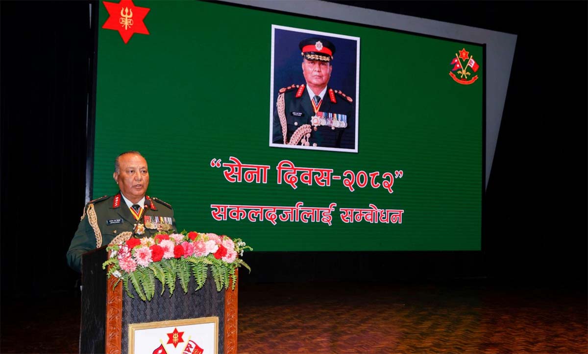 महाशिवरात्रि तथा २६२औँ सेना दिवसका अवसरमा आज सैनिक मुख्यालयमा आयोजित विशेष कार्यक्रममा नेपाली सेनाका सकल दर्तालाई शुभकामनासहित सम्बोधन गर्दै उहाँले नेपाली सेनाले विभिन्न क्षेत्रहरुमा निर्वाह गर्दै आइरहेको जिम्मेवारीलाई उत्कृष्ट ढंगले पूरा गर्ने क्रममा निर्वाचनलाई शान्तिपूर्ण रुपमा सम्पन्न गराउन समेत विशेष निर्देशन दिनुभयो ।