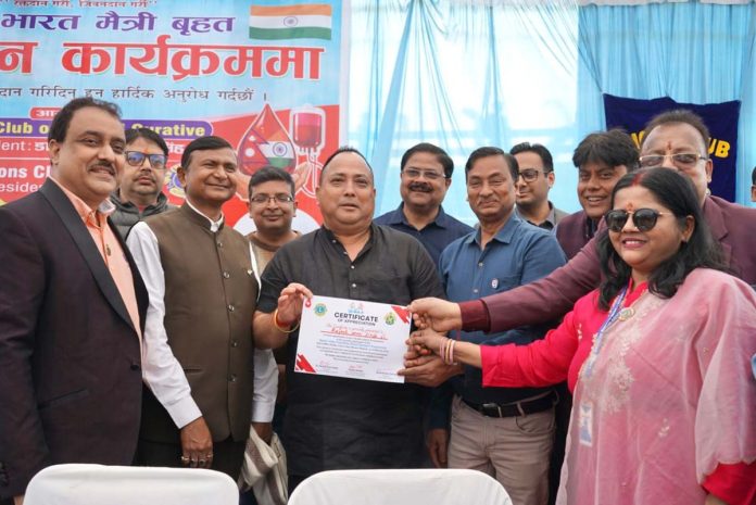 वीरगंज ०९ फागुन । लायन्स क्लब अफ रक्सौल र लायन्स क्लब अफ वीरगंजको संयुक्त आयोजनामा भारत–नेपाल मितेरी पुलमा रक्तदान शिविर शनिवार सम्पन्न भएको छ। शिविरमा नेपाल र भारतका गरी ६० जनाले रक्तदान गरेका छन्, जसमा ३५ जना नेपाली र २५ जना भारतीय सहभागी थिए।