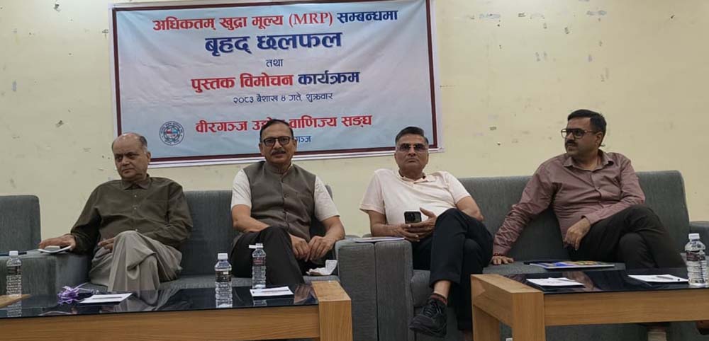 वीरगंज ०४ बैशाख । एमआरपी विषयमा छलफल तथा ‘समृद्ध मधेश’ नामक पुस्तक विमोचन कार्यक्रम शुक्रवार वीरगंज उद्योग वाणिज्य संघको सभाहलमा सम्पन्न भएको छ।