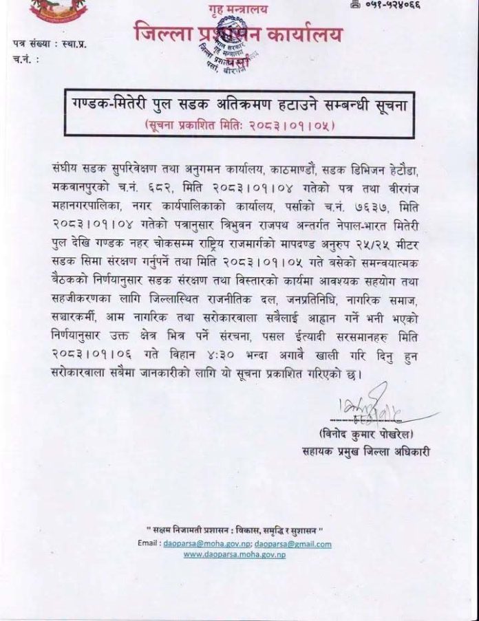 संघीय सडक सुपरिवेक्षण तथा अनुगमन कार्यालय, काठमाण्डौं, सडक डिभिजन हेटौडा, मकवानपुरको च.नं. ६८२, मिति २०८३।०१।०४ गतेको पत्र तथा वीरगंज महानगरपालिका, नगर कार्यपालिकाको कार्यालय, पर्साको च.नं. ७६३७, मिति २०८३।०१।०४ गतेको पत्रानुसार त्रिभुवन राजपथ अन्तर्गत नेपाल–भारत मितेरी पुल देखि गण्डक नहर चोकसम्म राष्ट्रिय राजमार्गको मापदण्ड अनुरूप २५–२५ मिटर सडक सीमा संरक्षण गर्नुपर्ने भन्दै सो क्षेत्रमा बनेका भौतिक संरचना हटाउन सूचना जारी गरेको हो।
