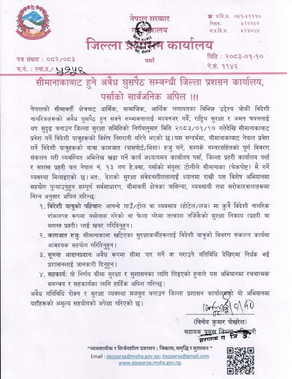 देशको सुरक्षा संवेदनशीलतालाई ध्यानमा राखी यस विशेष अभियानमा सहयोग पुर्याउनुहुन सम्पूर्ण सर्वसाधारण, सीमावर्ती क्षेत्रका बासिन्दा, व्यवसायी तथा सरोकारवालाहरूमा अपिल समेत जिल्ला प्रशासन कार्यालय,पर्साले गरेको छ । विदेशी यात्रीको पहिचानः आफ्नो गाउँ–टोल वा व्यवसाय (होटेल–लज) मा कुनै विदेशी नागरिक शंकास्पद रूपमा बसोबास गरेको वा फेला परेमा तत्काल नजिकैको सुरक्षा निकाय (प्रहरी वा सशस्त्र प्रहरी) लाई खबर गर्न प्रशासनले आग्रह गरेको छ ।